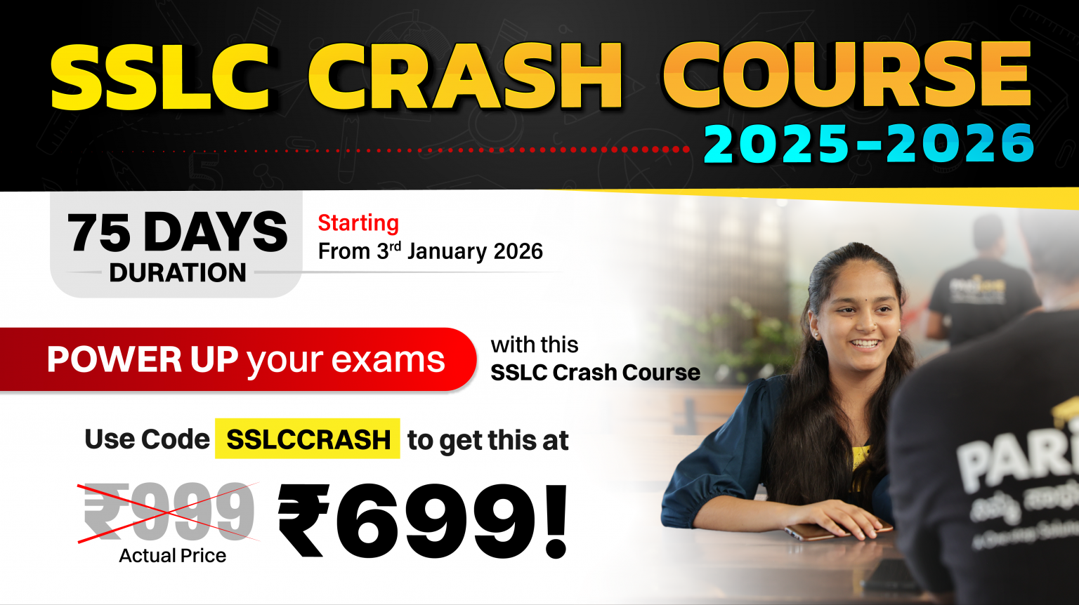 - 75-day fast-track crash course starting 3rd January, 2026 covering the entire SSLC syllabus with simple explanations, daily live classes, PYQs, MIQs, and regular tests.