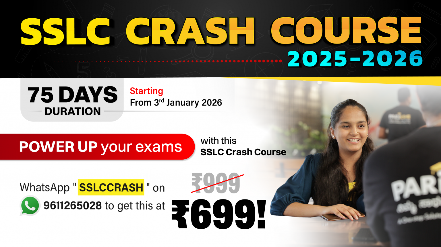 • 75-day fast-track crash course starting 3rd January, 2026 covering the entire SSLC syllabus with simple explanations, daily live classes, PYQs, MIQs, and regular tests.
